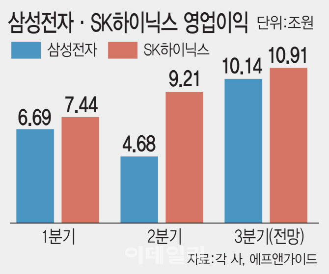 [이데일리 김소연 기자] 메모리 슈퍼 사이클 덕분에 올해 3분기 삼성전자(005930)와 SK하이닉스(000660) 두 기업 모두 영업이익이 10조원을 넘으리라는 관측이 나온다. SK하이닉스는 창사 이래 처음으로 분기 영업이익 10조원을 돌파할 전망이다.