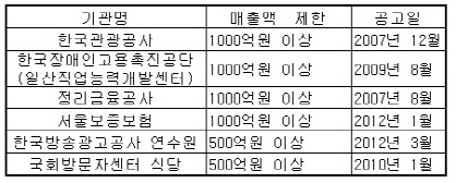 또 일부 공공기관들에서는 급식사업장 입찰을 할 때 매출액을 기준으로 일정액 이상인 업체들만 입찰에 참여할 수 있도록 제한하면서 중소업체들의 원성을 사기도 했다.