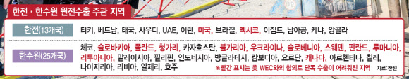이에 한전은 미국·아랍에미리트(UAE)·베트남 등 13개국, 한수원은 체코와 루마니아, 필리핀, 캐나다 등 25개국을 맡아 수주 활동을 펼쳐 왔다. 한국형 원전을 그대로 쓸 수 있는 국가는 한전이 담당하고, 설계 변경이 필요한 국가는 한수원이 주도하는 방식이다.