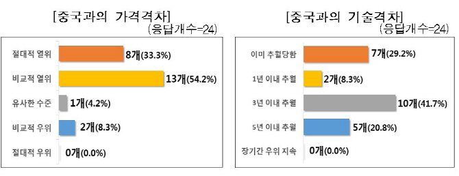 향후 경쟁력 전망에 대해서도 응답단체 24곳 중 22곳이 중국과의 경쟁에 부정적 전망을 했다. 일본과의 경쟁력 전망에서도 응답단체 20곳 중 13곳이 악화를 예상해 중·일에 기술과 가격 경쟁력 모두에서 위기감이 높았다.