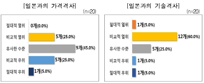 경쟁 일본기업에 기술적으로 뒤쳐질(13곳) 뿐만 아니라, 가격 경쟁력마저 일본에 비해 유사하거나 열세에 있다고 응답한 단체도 14곳인 것으로 나타났다.
