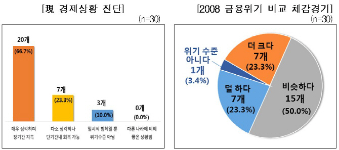 2008년 금융위기와 비교했을 때 체감하는 수준이 ‘더 크다’는 답변이 7개, ‘비슷하다’는 답변이 15개로, 현재 경제상황을 심각하게 인식하고 있는 것으로 조사됐다.