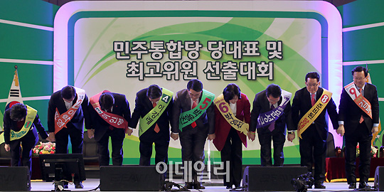 [이데일리 김정욱 기자] 민주통합당 대표 경선 후보들이 15일 오후 경기도 고양시 일산 킨텍스에서 열린 민주통합당 전당대회에 참석해 인사를 하고 있다.(한명숙, 이학영, 이인영, 이강래, 박용진, 박영선, 문성근, 박지원, 김부겸 후보. 사진 왼쪽부터)