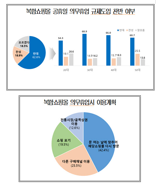 이번 조사는 최근 6개월 이내에 복합쇼핑몰을 방문한 서울·수도권 소비자 1000명을 대상으로 실시했다. 조사결과, 복합쇼핑몰 영업규제(월 2회 공휴일 의무휴업) 찬반 여부를 묻는 질문에 대해 응답자의 62.6%는 반대 의사를 밝혔고, 찬성은 18.9%로 나타났다. 나머지 18.5%는 ‘잘 모르겠다’고 답했다.