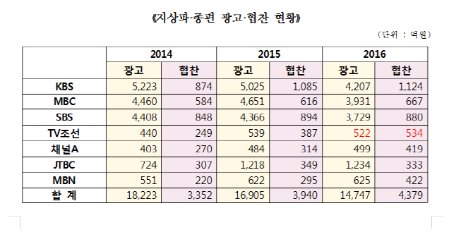 지상파 방송의 경우 최근 3년 광고 매출이 줄어든 반면 협찬 매출은 꾸준히 증가하고 있다. 종편 또한 JTBC를 제외하고는 협찬과 광고 매출이 비슷하고, TV조선은 지난해 광고매출보다 협찬매출이 더 많았다.