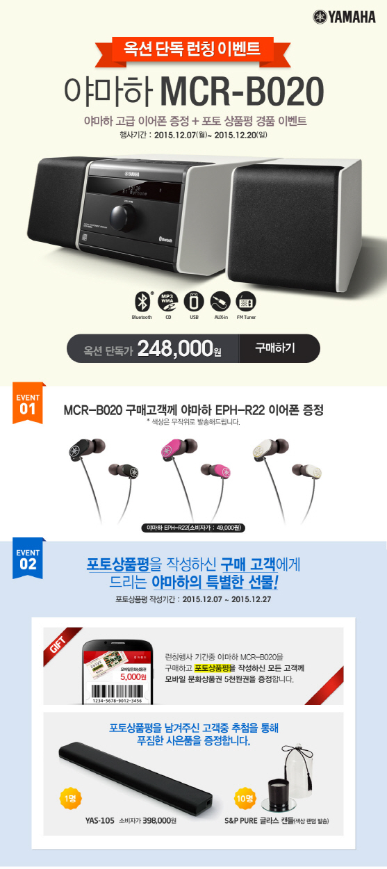 한편 오는 7일부터 20일까지 옥션 단독 출시를 기념해 야마하 이어폰 증정 및 포토상품평 이벤트도 진행한다. 오디오를 구매하는 모든 구매고객에게 야마하 EPH-R22 이어폰(소비자가: 4만 9000원)을 증정한다.