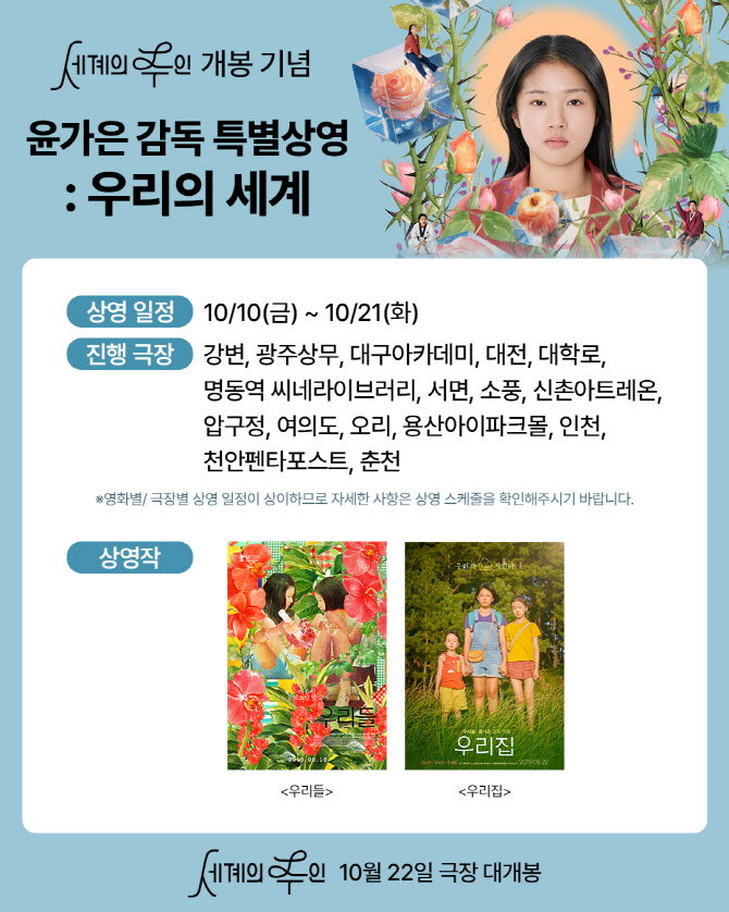 오는 22일 ‘세계의 주인’ 개봉을 맞아 윤가은 감독의 장편 전작을 만날 수 있는 기회를 마련한 CGV아트하우스 ‘윤가은 감독 특별상영: 우리의 세계’에서는 제66회 베를린국제영화제 K플러스 부문에 초청된 작품이자 가수 아이유, 개그우먼 장도연 등 수많은 이들의 인생 영화로 손꼽히는 장편 데뷔작 ‘우리들’과 봉준호 감독의 극찬을 끌어낸 ‘우리집’까지 윤가은 감독의 장편 전작을 상영한다. ‘윤가은 감독 특별상영: 우리의 세계’는 CGV강변, 광주상무, 대구아카데미, 대전, 대학로, 명동역 씨네라이브러리, 서면, 소풍, 신촌아트레온, 압구정, 여의도, 오리, 용산아이파크몰, 인천, 천안펜타포트, 춘천까지 16개 극장에서 바로 오늘(10일)부터 21일까지 진행되며, 더 깊고 풍성해진 윤가은 감독의 영화 세계를 만날 수 있는 ‘세계의 주인’이 개봉하기 전에 윤가은 감독의 전작을 정주행을 하고 싶은 영화팬들에겐 특별한 자리가 될 예정이다.