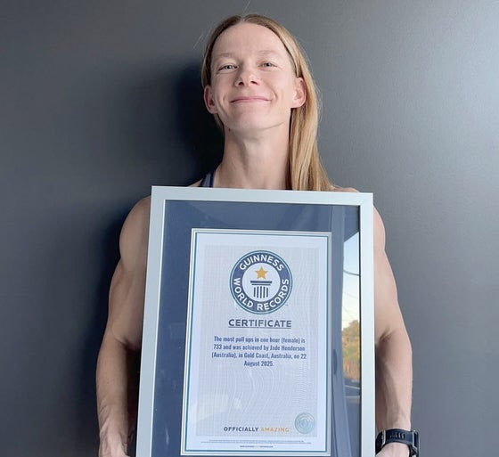 13일 기네스월드레코드(GWR)에 따르면 지난 8월 22일 호주 경찰관 제이드 헨더슨(32)은 세계 기록 도전에 나서 ‘1시간 동안 턱걸이를 가장 많이 한 여성’으로 등극했다.