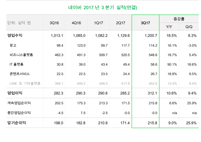 IT플랫폼 부문은 네이버페이의 거래액 및 가맹점 성장에 힘입어 전년동기 대비 90.1%, 전분기 대비 18.6% 증가한 586억 원을 달성했다. 콘텐츠서비스 부문은 웹툰과 V LIVE 등의 성장으로 전년동기 대비 18.8%, 전분기 대비 9.5% 증가한 267억 원을 기록했다.