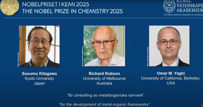 스웨덴 왕립과학원 노벨위원회는 8일 금속·유기 골격체(MOF) 개발에 기여한 공로로 기타가와 스스무(일본 교토대)·리차드 롭슨(호주 멜버른대)·오마르 야기(미국 캘리포니아대 버클리캠퍼스)에게 노벨 화학상을 수여하기로 결정했다고 발표했다.