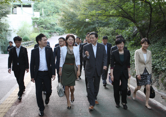 [이데일리 김보리 기자] 지난 2일 오후, 임영록 KB금융지주 신임 회장과 직원들은 ‘CEO와의 대화’를 위해 남산 둘레길을 찾았다. 으례 ‘CEO와의 대화’라 하면 격식있는 식당에서 다소 딱딱한 분위기 속에서 진행되는 것과 사뭇 다른 풍경이었다. 임 회장은 직원들과 가을나들이를 함께하는 등 스킨십 리더십에 시동을 걸었다.