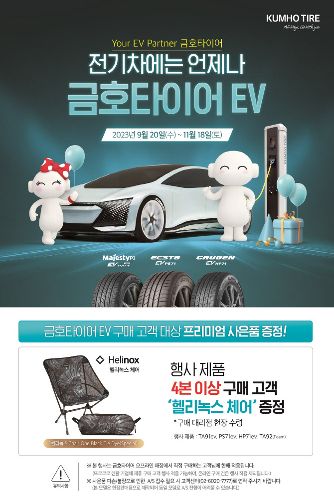 이번 프로모션은 금호타이어 전기차용 타이어 ‘마제스티9 EV SOLUS TA91’, ‘크루젠 EV HP71’, ‘엑스타 EV PS71’를 전국 타이어프로 매장에서 구매하는 고객을 대상으로 프리미엄 헬리녹스 캠핑의자 (4개 구매시)를 증정한다. 또한 SUV용 타이어 크루젠 HP71, HP51를 구매하는 고객에게는 차량용 소화기(4개 구매시)를 제공한다. 행사에 관한 자세한 사항은 금호타이어 공식 홈페이지를 통해 확인할 수 있다.