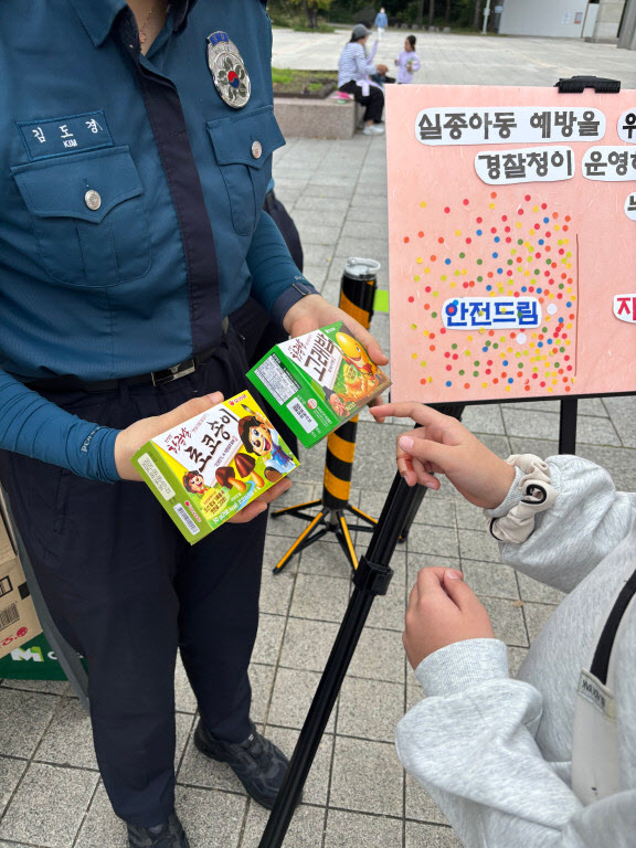 | | 서울 용산경찰서 소속 경찰관이 9일 2025 국립한글박물관 한글날 기념 문화행사를 찾은 아이에게 과자를 나눠주고 있다. (사진= 용산경찰서 제공) |