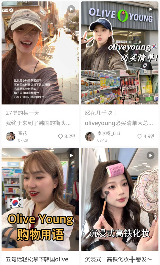 | | 중국 SNS 샤오홍슈에서 검색 되는 올리브영 관련 게시글들. (사진=샤오홍슈 캡쳐) |