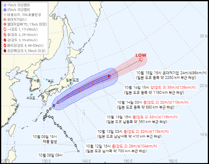 이후 13일 오전 3시 중심기압 975hPa, 최대풍속 초속 32m/s(시속 115km)의 중급 태풍으로 발달해 일본 도쿄 남남서쪽 약 410km 부근 해상을 따라 동북동진할 것으로 보인다.