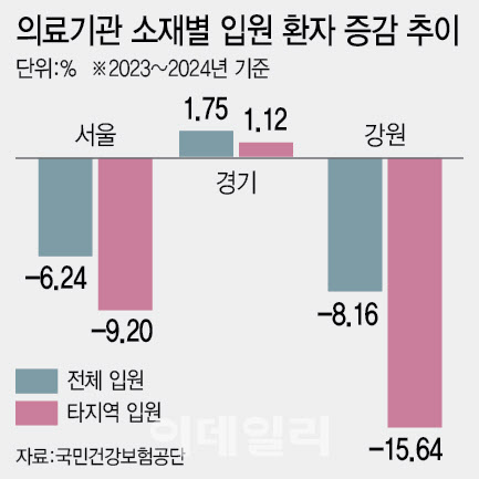 환자들 입장에선 자기 집 앞에 있는 종합병원을 먼저 선택할 수도 있겠지만, 그 대신 서울부터 알아보고 자리 없으면 경기·인천 병원을 알아보는 모습을 보였다. 강원도에 있는 의료기관은 지난해 전체 입원 환자가 1만 7034명, 전북 지역은 7813명 줄었다.