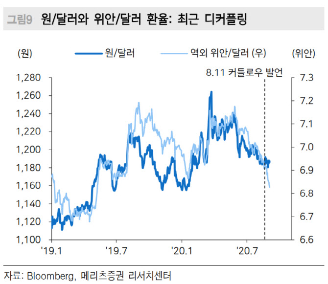 이승훈 메리츠증권 연구원은 “위안화와 원화가 한동안 달러화 약세에서 소외됐다”면서 “일부 시장 참여자들이 미·중 갈등 고조가 무역분쟁 이슈로 전이될 가능성을 우려했기 때문으로 이는 위안화의 강세를 제약하는 요인으로 작용했다”고 분석했다.