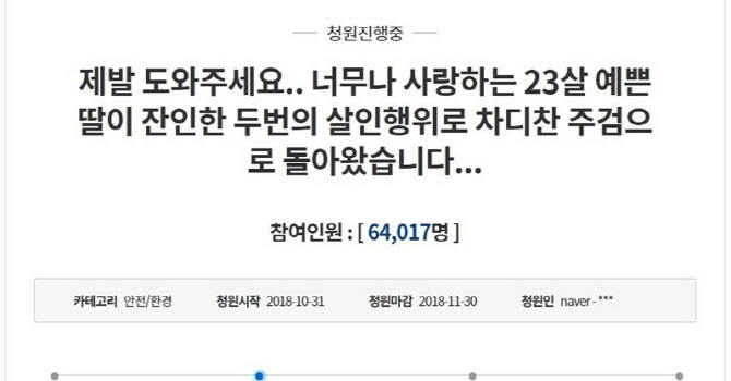 2018년 10월 31일 당시 청와대 국민청원 홈페이지에는 상견례를 앞두고 연인을 잔인하게 살해한 뒤 시신을 훼손한 ‘춘천 예비신부 살인사건’과 관련 유족들이 가해자 심모씨(당시 28세 ·남)를 엄벌에 처해야 한다며 신상공개에 대한 목소리를 높였다.