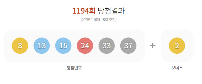 로또복권 운영사 동행복권은 18일 제1194회 로또 추첨 결과 1등 당첨번호가 ‘3·13·15·24·33·37’이라고 밝혔다. 보너스 번호는 ‘2’이다.