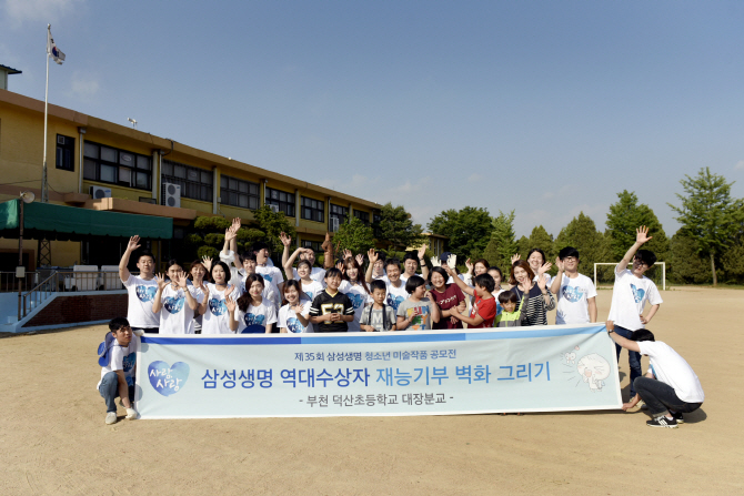 [이데일리 김영수 기자] 삼성생명은 지난 30일 경기도 부천에 위치한 부천덕산초등학교 대장분교에서 청소년 미술작품 공모전 역대 수상자와 국민대 미대생 등 40여명이 모여 ‘사랑 나눔 벽화 그리기’를 진행했다고 밝혔다.