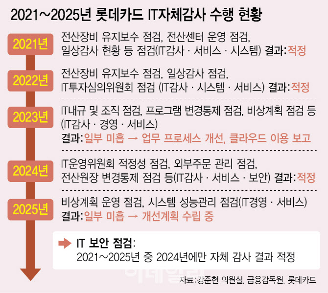 실제 롯데카드는 자체 감사에서 IT보안에 ‘셀프 합격점’을 줬다. 롯데카드는 지난 2021년부터 2025년까지의 IT 자체 감사 중 지난해에만 보안 부문 감사를 시행했다. IT운영위원회 적정성, 외부주문 관리, 전산원장 변경통제 등을 점검한 결과 스스로 ‘적정하다’고 평가했다. 2022년, 2023년에도 IT 서비스·시스템 등을 자체 감사한 결과 ‘적정하다’고 판단했다. 같은 기간 다른 카드사가 개인신용정보시스템 접근통제, 정보보호 취약점 분석·평가, 개인정보 유출방지 대책, 전자금융사고 보고·이행체계 등을 점검한 것과 비교하면 IT보안 내부통제가 부실했던 것이다.