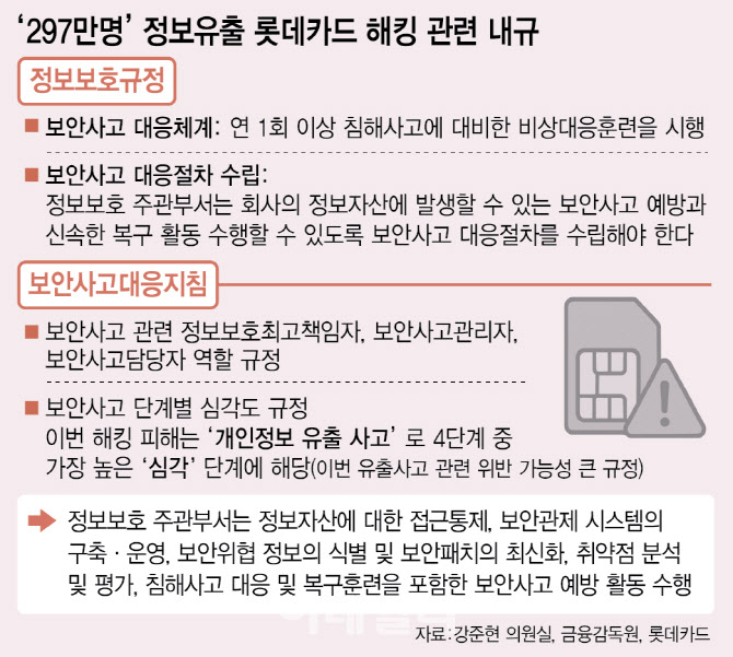 21일 금융감독원이 국회 정무위원회 강준현 의원실에 제출한 자료를 이데일리가 입수해 분석한 결과 이번 297만명 회원 정보 유출과 관련 롯데카드는 스스로 마련한 규정과 지침마저 지키지 않은 것으로 나타났다. 이번 해킹의 발단이 됐던 보안패치와 관련 롯데카드는 보안사고대응지침을 통해 “정보보호 주관부서는 보안위협 정보의 식별과 보안패치의 최신화 등을 포함한 보안사고 예방 활동을 수행해야 한다”고 명시하고 있다.