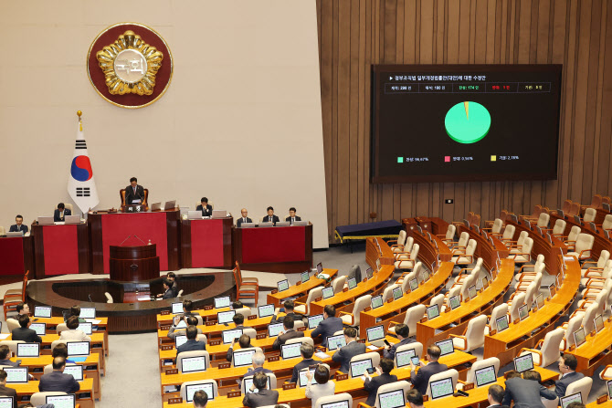 | | 26일 서울 여의도 국회 본회의에서 정부조직법 일부개정법률안에 대한 수정안이 통과되고 있다.(사진=연합뉴스) |