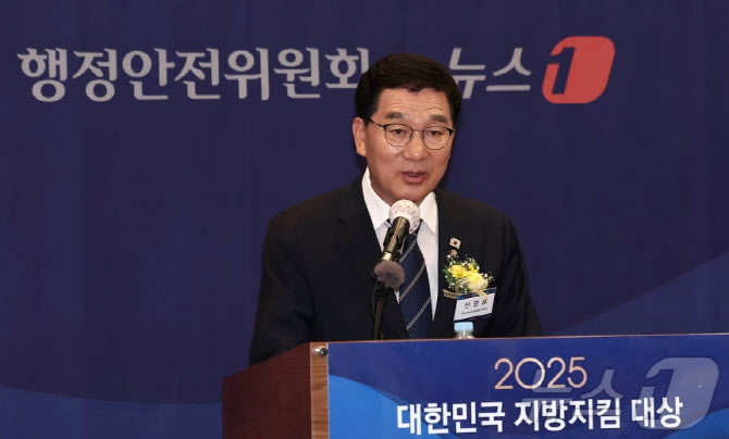 신정훈 국회 행정안전위원회 위원장이 지난달 24일 서울 중구 프레스센터에서 열린 ‘2025 대한민국 지방지킴 대상’ 시상식에서 축사를 하고 있다. (사진=뉴스1)