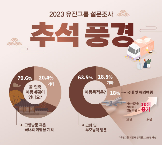 유진그룹이 최근 유진기업, 유진투자증권, 동양, 유진홈센터, 유진로지스틱스, 유진한일합섬 등 계열사 임직원 1295명을 대상으로 진행한 올해 추석명절 계획 설문조사에 따르면 해외여행을 계획하고 있다는 응답자 수가 지난해 추석연휴에 비해 약 10배 이상 증가했다.
