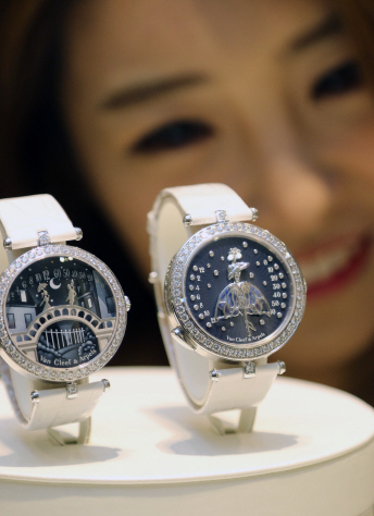 [이데일리 염지현 기자] 6일 오전 서울 소공로 신세계백화점 본점에서 모델들이 쥬얼리·시계 브랜드인 ‘반클리프 아펠’의 ‘퐁 데 자모르’(좌측), ‘레이디 아펠 발레리나 앙상떼’을 선보이고 있다. ‘레이디 아펠 발레리나 앙상떼’는 전설 속의 무용가 안나 파블로바를 모티브로 화려한 에나멜링 노하우로 장식됐다. 신세계는 오는 13일까지 본점 본관에서 롤렉스, 까르띠에, IWC, 바쉐론 콘스탄틴, 오메가, 브라이틀링, 제니스, 반클리프아펠 등 유명 럭셔리 시계 브랜드들과 함께 ‘럭셔리 와치 페어’를 펼친다.