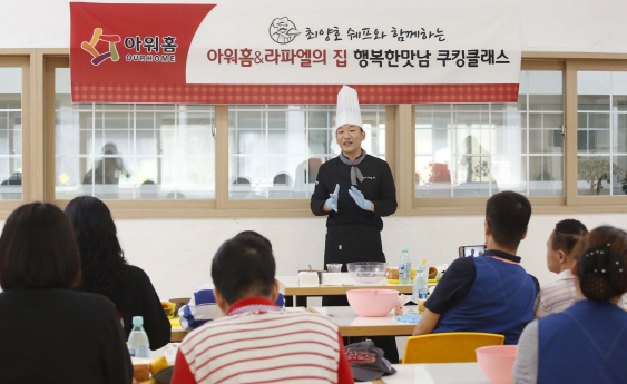 | | 아워홈 셰프가 경기 여주 ‘라파엘의 집’에서 열린 쿠킹클래스에 참여한 시각장애인과 생활재활교사에게 요리 법을 강의하고 있다. (사진=아워홈) |