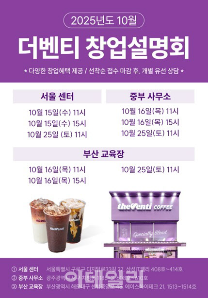 [이데일리 노희준 기자] 커피 프랜차이즈 더벤티가 서울, 부산, 광주에서 10월 정기 창업설명회를 개최한다고 13일 밝혔다.