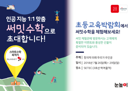 대교 관계자는 “써밋수학은 학습자의 기초정보를 통해 인공지능을 활용한 개별 맞춤형 학습 프로그램으로, 문제 해결을 위한 보완점을 정밀하게 분석해 제시한다”며 “이번 박람회에서 ‘눈높이’의 대표 디지털 수학제품인 써밋수학을 체험해 기존의 수학 제품들과 차별화된 눈높이만의 학습 노하우를 만나보길 바란다”고 밝혔다.