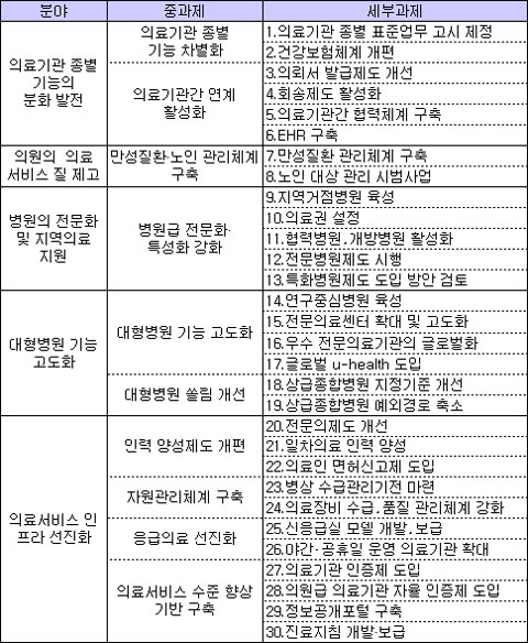의원은 외래환자에 대해 포괄적이고 지속적인 의료서비스를 제공하는 만성질환·노인 관리체계를 구축함으로써 일차의료의 역할을 강화하고, 병원은 전문병원화를 통해 경쟁력 강화를 꾀하자는 취지다.