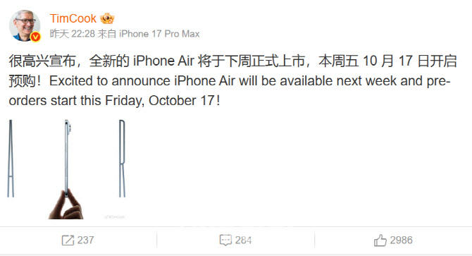 아이폰 에어는 지난달 19일 다른 지역에서 먼저 출시되었으나, 애플의 핵심 시장인 중국에서는 통신사들이 eSIM 지원 환경을 구축하는 데 시간이 걸리면서 출시 일정이 연기된 바 있다.