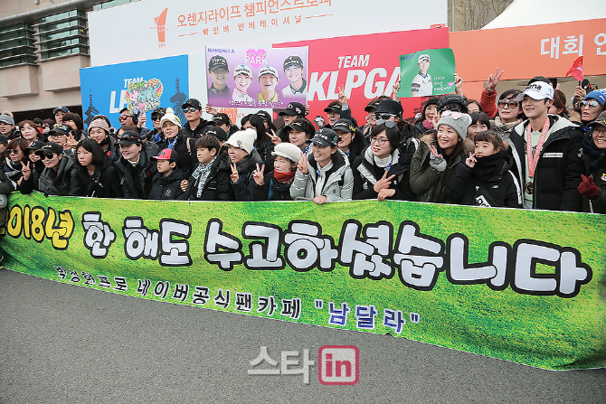 [이데일리 골프in 경주(경북)=박태성기자] 25일 경북 경주시에 위치한 블루원 디아너스컨트리클럽(파72/6,460야드)에서 세계 최강 대한민국 여자골퍼들이 출전하는 '오렌지라이프 챔피언스트로피(총상금 10억 원ㅣ우승팀 6억 원ㅣ준우승팀 4억 원) 최종 3라운드 싱글매치가 열린가운데,팀 LPGA가 13점으로 11점을 획득한 팀 kLPGA를 꺾고 우승트로피를 들어올렸다.남달라 박성현(25.KEB하나금융)이 팬클럽 회원들과 기념 촬영을 하고 있다.