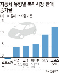 블룸버그가 3일(현지시간) 각 자동차업체 월간 판매량 통계를 집계하고 분석한 결과 올들어 지난 9월말까지 북미시장에서 판매된 자동차 가운데 소형 스포츠유틸리티 자동차(SUV) 크로스오버(Crossover)와 SUV, 미니밴, 픽업트럭 등이 가장 빠른 판매 성장세를 보였다.