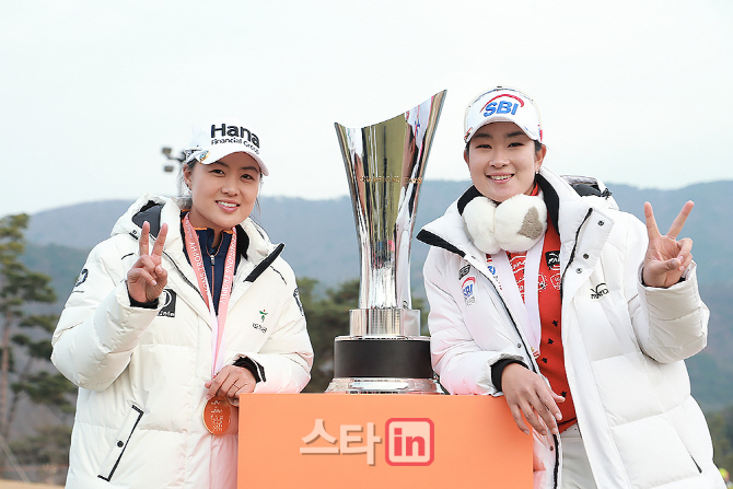 [이데일리 골프in 경주(경북)=박태성기자] 25일 경북 경주시에 위치한 블루원 디아너스컨트리클럽(파72/6,460야드)에서 세계 최강 대한민국 여자골퍼들이 출전하는 '오렌지라이프 챔피언스트로피(총상금 10억 원ㅣ우승팀 6억 원ㅣ준우승팀 4억 원) 최종 3라운드 싱글매치가 열린가운데,팀 LPGA가 13점으로 11점을 획득한 팀 kLPGA를 꺾고 우승트로피를 들어올렸다.이민지(22.KEB하나금융)와 김아림(23.SBI)이 MVP상을 수상하고 있다.