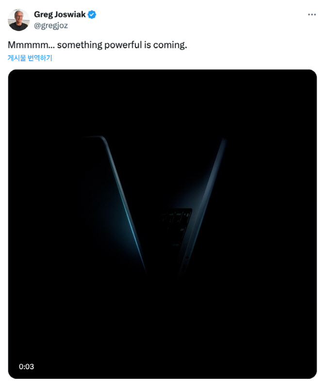 그렉 조즈위악 애플 마케팅 수석 부사장은 14일(현지시간) X(옛 트위터)에 “강력한 무언가가 온다(something powerful is coming)”는 문구와 함께 짧은 영상을 게시했다. 해당 영상에는 ‘coming soon’이라는 문구와 함께 맥북 프로 측면 실루엣이 V자 형태로 등장한다.