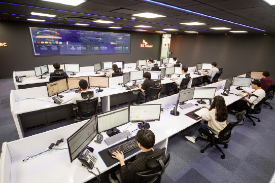 | | SK인포섹 시큐디움 센터(Secudium Center)에서 관제 요원들이 사이버 위협을 모니터링하고 있다.(사진=SK인포섹 제공) |