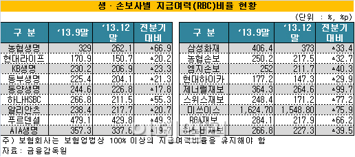 RBC비율이란 가용자본을 요구자본으로 나눈 값으로, 보험사가 예상하지 못한 손실이 생겨도 보험금을 지급할 수 있는 자본이 어느 정도 있는지를 보여주는 지표다. 금감원은 최소 요건인 100%보다 높은 150% 이상을 유지하도록 권고하고 있다. 만약 이 비율이 100% 미만으로 떨어지면 경영개선권고, 50% 미만이면 경영개선요구, 1% 미만이면 경영개선명령 등의 적기시정조치를 받게 된다.
