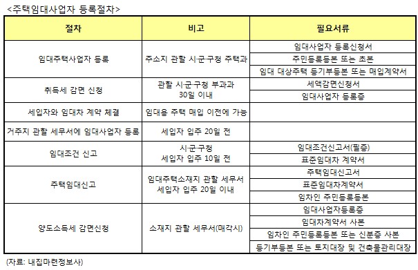 등록절차는 시·군·구청 등 기초자치단체에서 임대주택사업 등록을 하고, 사업을 시작한지 20일 이내에 관할 세무서에 사업자 신고를 해야 한다.