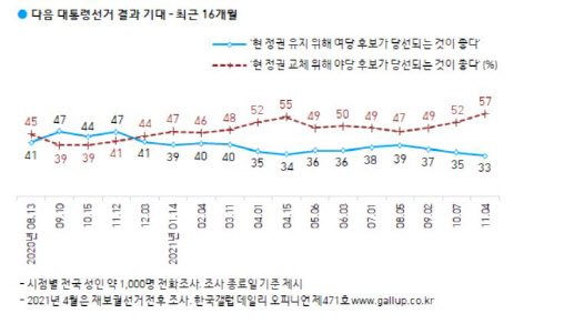 여론조사업체 한국갤럽이 지난 2~4일 전국 만 18세 이상 1000명을 대상으로 내년 대선에서 여야 주장 중 어느 쪽에 더 동의하는지 물은 결과 57%가 ‘정권교체를 위해 야당 후보가 당선되는 것이 좋다’고 응답했다. 33%는 ‘현 정권 유지를 위해 여당 후보가 당선되는 것이 좋다’고 답했다. 11%는 의견을 유보했다.