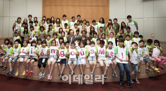 | ‘하나키즈오브아시아 여름 캠프’에 참여한 다문화가정 아동들이 임영호 하나금융 부사장과 가수 인순이씨(가운데)와 함께 기념촬영을 하고있다. |