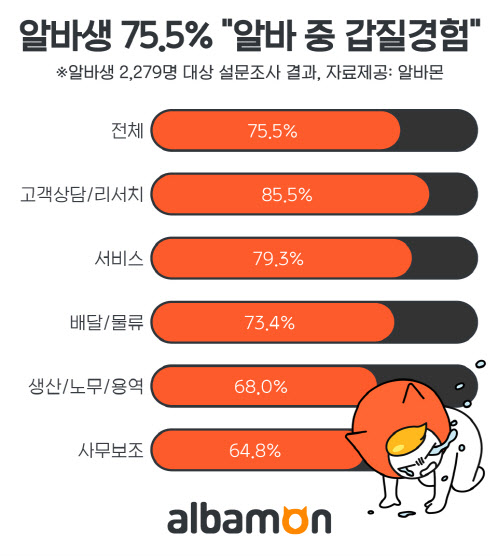 아르바이트 포털 알바몬이 최근 알바생 2279명을 대상으로 ‘아르바이트 근무 중 갑질 경험’을 주제로 설문조사한 결과 이같이 나타났다고 17일 밝혔다.