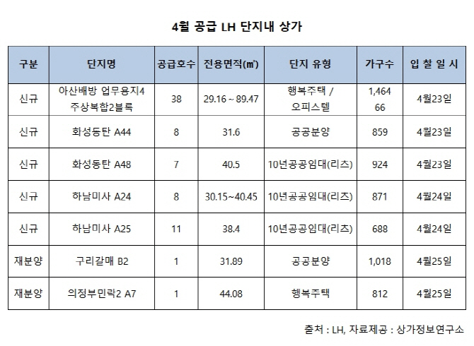 [이데일리 정다슬 기자] 이달 말 한국토지주택공사(LH) 단지 내 상가가 아산 배방·화성 동탄 등지에서 분양된다. 올 들어 최다 물량이다.