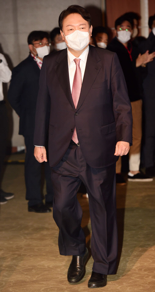 | | 윤석열 국민의힘 대선 후보가 5일 오후 서울 용산구 백범김구기념관에서 열린 국민의힘 제2차 전당대회에서 단상에 오르고 있다.(사진=국회사진취재단) |