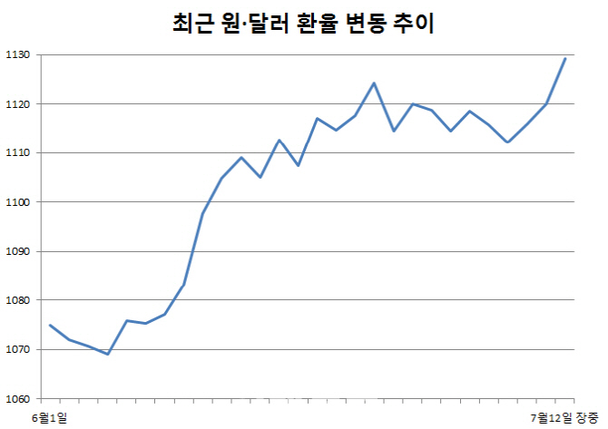 원화 가치도 덩달아 하락하고 있다. 외환시장 전문가들은 이날 원·달러 환율이 1130원대 상승도 가능하다고 보고 있다.
