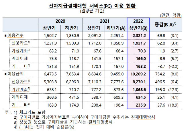 21일 한국은행이 발간한 ‘2022년 상반기 중 전자지급서비스 이용 현황’에 따르면 전자지급결제대행 서비스(PG) 이용실적은 일평균 2321만건, 1조209억원으로 전기 대비 각각 3.1%, 8.0% 증가했다.