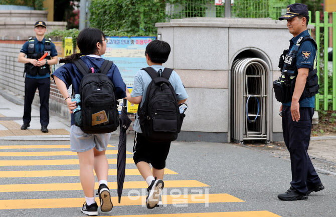 | | 초등학생 납치 미수 등 아동 대상 범죄가 잇따르는 가운데 지난 달 12일 대구 동구 한 초등학교 앞에서 동촌지구대, 기동순찰대가 예방 순찰을 하고 있다.(사진=뉴시스) |